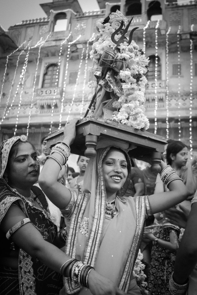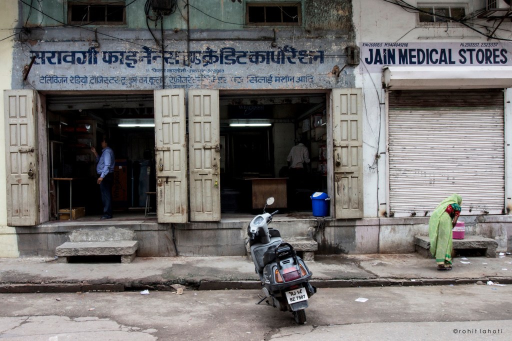 Streets of a place also gives visibility to various layers and what is happening in those layers. I saw this prominently happening in the old part of Jaipur, early in the morning, when the city-life was steadily unfolding. In the photograph there, one can see the distinctions we have in our society. On one hand, the owner of the commercial space is praying, on the other hand, another layer in the foreground shows the lady doing her daily cleaning work.