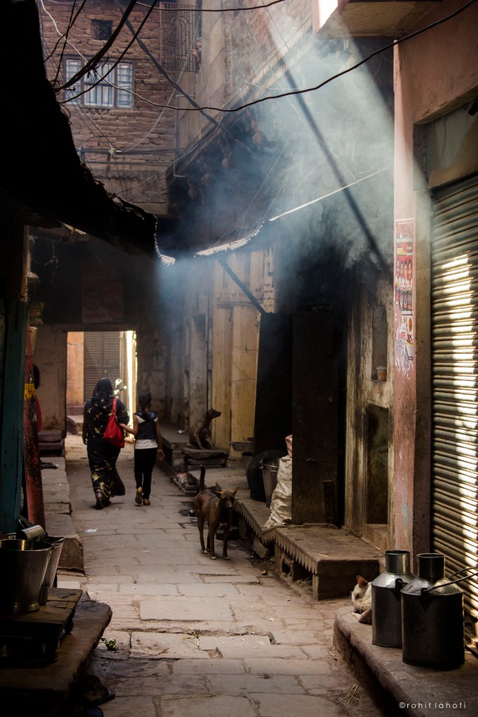 Streets are accommodative of people while Indian streets are accommodative of animals as well. This was prominently evident during my time in Varanasi when I had to stop multiple times while moving through the labyrinth in order to provide the space for cows to pass. In an early morning photograph there, one can see the shared nature of the alley along with the house extensions—also called otlas—used not only for people to sit but also to keep the milk tumblers. While these