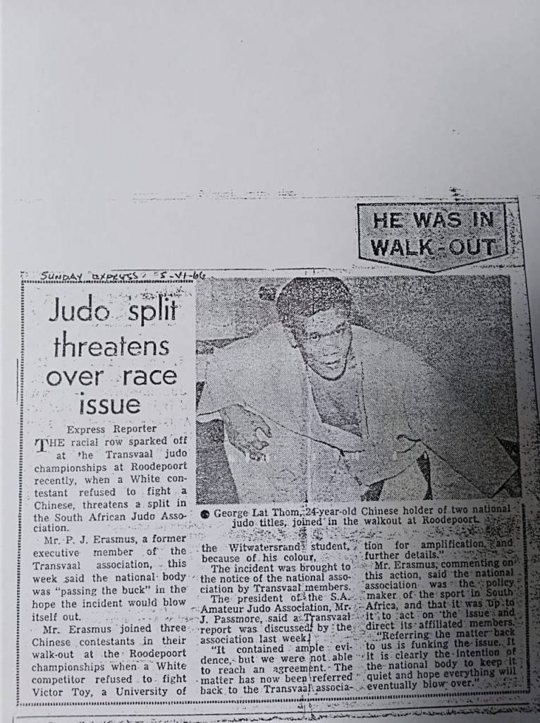 Until the 1966 provincial Judo championships in Roodepoort, practitioners of East Asian descent had avoided the exclusion that faced black South Africans. That was, until Victor Toy stepped up to compete. Although Lai Thom recalled it being Toy’s first tournament, an article from the time suggests that Toy, a 19 year old South African whose parents were Chinese, had competed at the provincial tournament the previous year, winning a title. Regardless, he would have had little sense that anything was untoward, as he took up his position and readied to bow to his opponent.