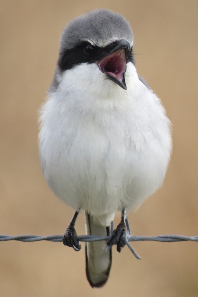 Watch Your Back – a male loggerhead shrike (Lanius ludovicianus) sings from barbed wire in La Belle, Florida, USA. Shrikes are predatory songbirds, known for their morbid caches of prey impaled on thorns. The barbs of this fence were dotted with the dried carcasses of frogs. January 2015.