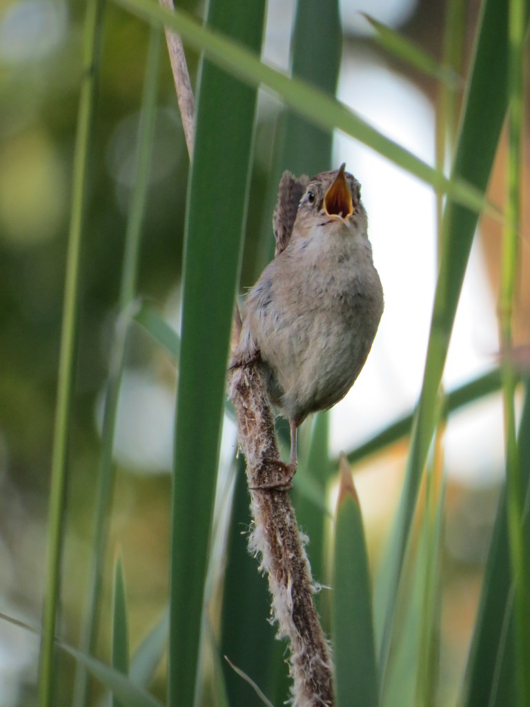 Marsh Wren Concert – a male marsh wren (Cistothorus palustris) sings his heart out in the Montlake Fill, an urban wetland in Seattle, Washington, USA. June 2014